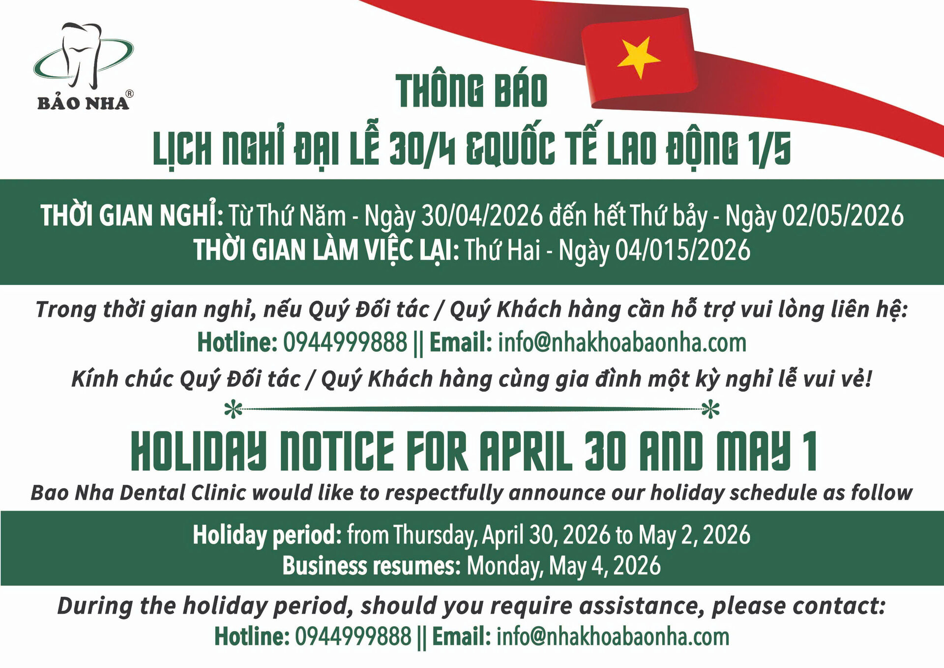 ⭐THỜI GIAN NGHỈ: Từ Thứ Năm - Ngày 30/04/2026 đến hết Thứ bảy - Ngày 02/05/2026