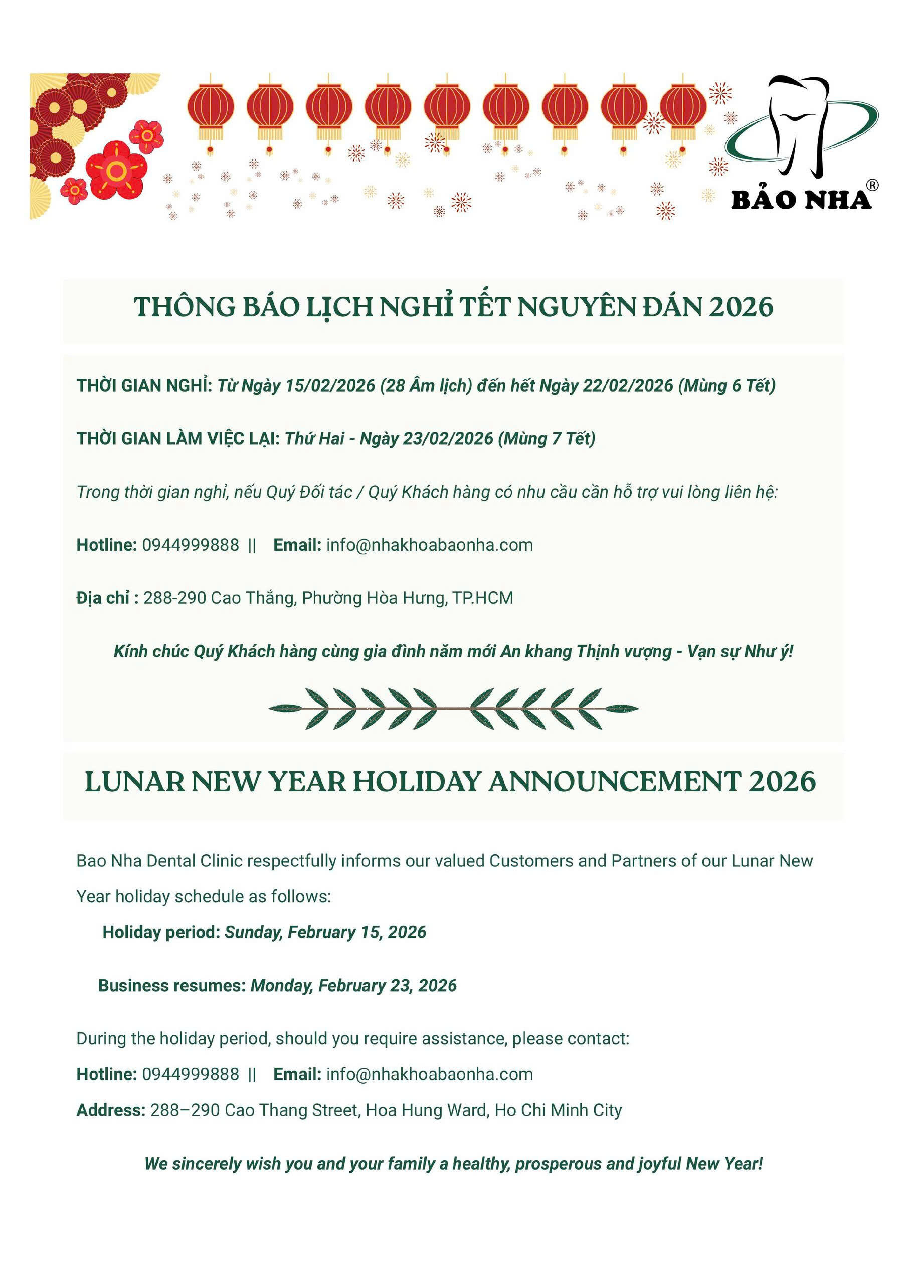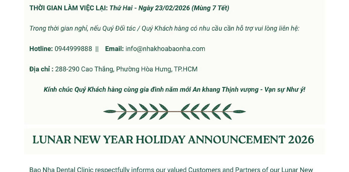 Bao Nha Dental Clinic respectfully informs our valued Customers and Partners of our Lunar New Year holiday schedule as follows: